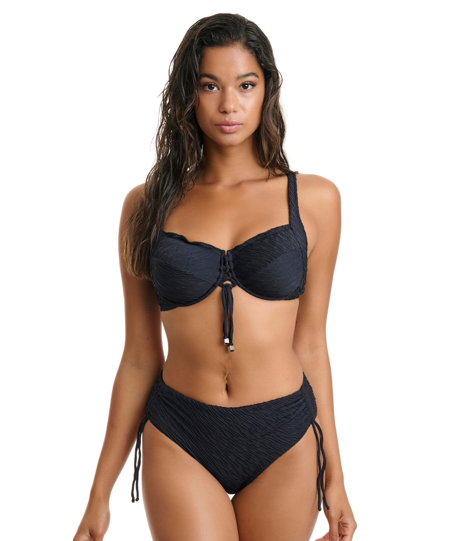 Μαγιό CUP F μπανέλα ρυθμιζόμενες τιράντες για τέλεια εφαρμογή, κούμπωμα στην πλάτη, ψηλοκάβαλο σλιπ με κορδονάκια στο πλάι για αυξομείωση. (75% Πολυαμίδη, 25% Ελαστάνη)